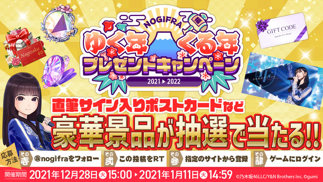 株式会社gumi(本社:東京都新宿区、代表取締役社長:川本寛之)は、『乃木坂的フラクタル』(以下、『乃木フラ』)において、2021年12月28日(火)より、ゲーム内アイテムや乃木坂46メンバー直筆サイン入りグッズ、豪華リアルグッズやギフトコードなどが貰える「乃木フラ ゆく年くる年キャンペーン'21-'22」及び2022年1月3日(月)までTwitter「乃木フラ」公式アカウントにて7日間連続でゲーム内アイテムがその場で貰える「7days Twitterキャンペーン」も同時開催するなど、さまざまなイベントを実施することをお知らせいたします。