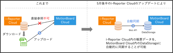 今回の連携により、「i-Reporter」内の報告書などの帳票データを、「MotionBoard Cloud」内のデータストレージに自動的に同期することが可能となります。