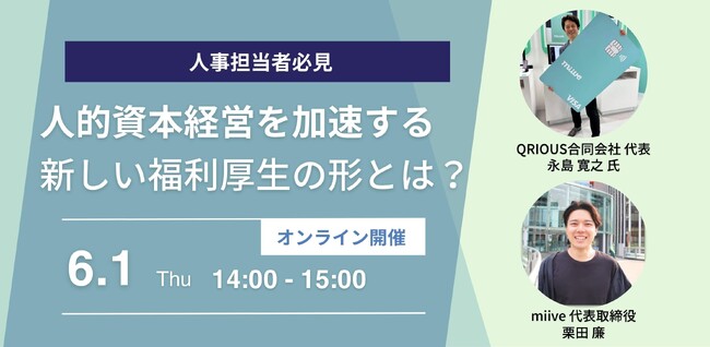 福利厚生プラットフォーム「miive」を開発・運営する株式会社miive(本社:東京都渋谷区、代表取締役:栗田 廉、読み:ミーブ)、2023年6月1日14:00から「人的資本経営を加速する新しい福利厚生の形とは?」と題したウェビナーを開催いたします。