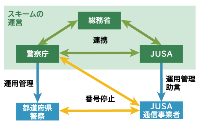 JUSAは、総務省・警察庁とともに番号停止スキームの運用を行うほか、本スキームに参加する通信事業者へ助言等を行い、警察と通信事業者の連携が円滑に行われるようサポートします。