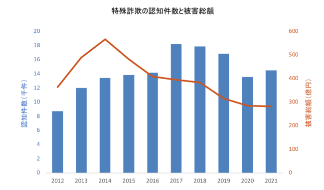 「オレオレ詐欺」をはじめとする特殊詐欺は、2014年には被害総額が過去最高の約566億円となりました。その後、取締り強化や民間事業者と連携した予防活動、犯行使用電話の利用制限等といった犯行ツール対策等の実施により被害額は減少傾向にあるものの、2021年の特殊詐欺の認知件数は約1万5,000件、被害総額は約282億円となっており、依然として被害状況は高水準で推移しています。
