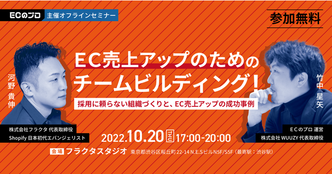 スピーカーとして、ブランドビジネスの支援活動、コマース業界の発展、Shopifyの普及をメインに全国的に活動する、Shopify 日本初代エバンジェリストでもある株式会社フラクタ 代表取締役 河野貴伸氏をゲストに迎えます。即戦力EC人材の採用ができずにお困りの方に是非ご参加いただきたい無料セミナーです。ECの売上を上げるためのノウハウや、ブランディングの効果測定の考え方、内製化に向けた組織作り、チームビルディングのノウハウをお伝えします。完全無料ですので、下記フォームより是非お気軽にお申込みください。