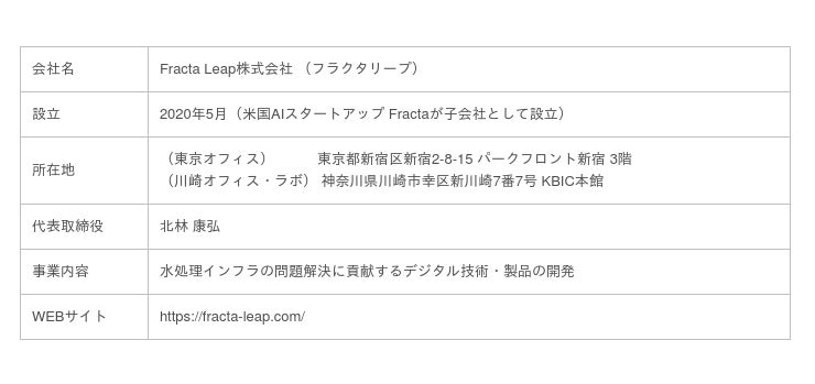 *1 「メタ・アクアプロジェクト」… 水処理インフラの持続可能性のために、デジタル技術による抜本的な生産性改善を目的として、2020年に発足したFracta Leapと栗田工業の共同プロジェクトです。主にAI・IoT技術を用いて、水処理プラントの設計・生産及び運転管理のスマート化(効率化・高度化)を推進しています。栗田工業では、2020年よりDXを推進する「デジタル戦略本部」を新設し、デジタル技術による事業の変容を加速しておりますが、本プロジェクトはその中核として位置付けられています。また、本プロジェクトは、Fractaグループと栗田工業の間での初めての本格的な共同案件であり、本プロジェクトを通じて両社の更なるシナジーを創出していきます。詳細は、2020年8月20日付プレスリリース(https://www.kurita.co.jp/aboutus/press200820.html)の内容をご参照ください。