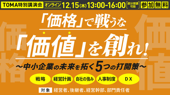 TOMAコンサルタンツグループ(所在地:東京都千代田区、グループ代表:市原 和洋)は2022年12月15日、中小企業の経営者・後継者・経営幹部・部門責任者を対象に、オンライン特別講演会『「価格」で戦うな「価値」を創れ!〜中小企業の未来を拓く5つの打開策〜』(参加費無料)を開催します。