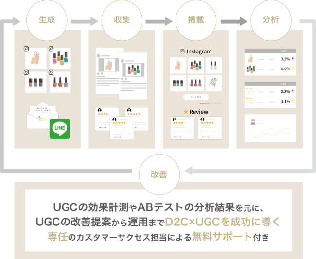UGCクリエイティブは、「InstagramのUGC(=写真と動画のUGC)」と「TikTokのUGC(=縦型ショート動画のUGC)」と 「レビューのUGC(=★とテキストのUGC)」の3つのUGCを生成→収集→掲載→分析→改善まで一気通貫で自動化させ、高速でUGCの活用⇔改善のPDCAを回すことで、D2C・単品リピート通販・EC企業の売上(新規CV率、引き上げ率、クロスセル率)を劇的に向上させるUGC活用ツールです。
