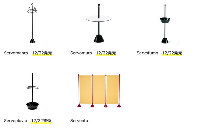 1961年から20年の歳月をかけ、ミラノのビアハウス「スプルンゲン」のために公共の場での「サーヴ」にも適したモジュール式の取り外し可能なシステムとしてデザインされたセルヴィシリーズ。ポリプロピレン製のベースと高さの異なる金属製のポールとの組み合わせにより、様々なバリエーションが展開されています。