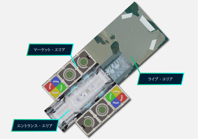 エントランス、マーケット、ライブの3つのエリアが存在する巨大展示会場で、決済機能を搭載したブースを制限なく設置可能です。