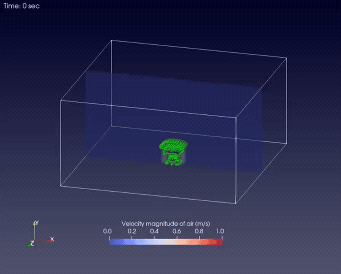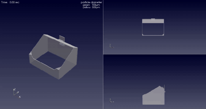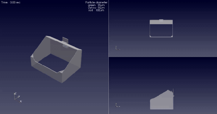 粒径100μm(緑)の場合は周辺流体との相互作用により粒子の初速度はすぐに減衰し器具の外側まで飛散しない。最大想定粒径500μm(黄)に関しては飛散面積の50%以上を防止し,特に奥側の飛散はすべての飛散を防止した。これにより飛散防止効果は99%から50%の間となった。