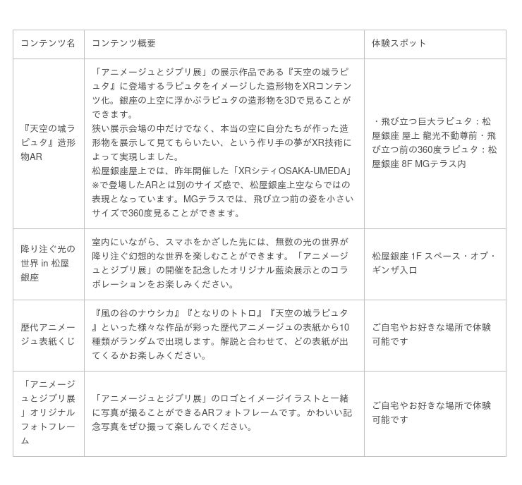 本イベントでは、お客さまに「XR City」アプリをダウンロードしたスマートフォンをかざしていただくことで、場所に応じた「アニメージュとジブリ展」とのコラボARコンテンツをお楽しみいただけます。松屋銀座館内で楽しめるコンテンツと、お客さまが家の中など好きな場所で表示をして楽しむことができるコンテンツがございます。コンテンツ詳細は別紙をご確認ください。