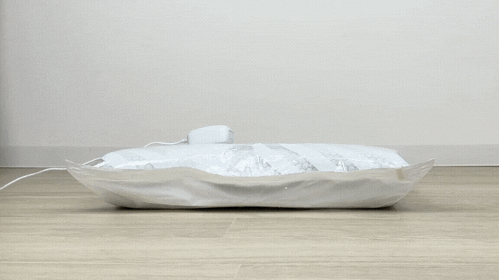 1. 【小型ながら驚異の圧縮力】かさばる衣類を“板状”にする60KPaの圧倒的パワー小型ながら、従来のファン式ポンプの常識を覆す10倍以上の吸引力を実現。冬物のかさばる衣類も瞬時にカチカチの状態まで圧縮し、体積を半分以下に減らします。