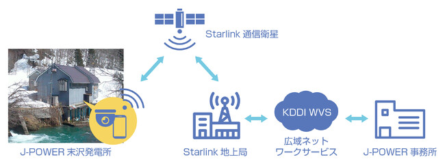 電源開発株式会社(以下「Jパワー」、本社:東京都中央区、代表取締役社長 社長執行役員:菅野 等)とKDDI株式会社(以下「KDDI」、本社:東京都千代田区、代表取締役社長 CEO:高橋 誠)は、J-POWERテレコミュニケーションサービス(株)と合同で、10月3日よりKDDIが法人・自治体向けに提供する衛星ブロードバンド「Starlink Business」(以下「Starlink」)※1と広域ネットワークサービス「KDDI Wide Area Virtual Switch 」(以下「KDDI WVS」)を導入し、保守高度化による電力の安定供給に向け、山間部での高速・大容量のネットワーク通信の実証試験を末沢発電所(新潟県魚沼市)のリパワリング工事※2にて開始しました。