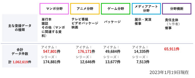 メディア芸術データベースでは、主にマンガ分野の「単行本」「雑誌」、アニメーション分野の「テレビ番組」「劇場映画」「ビデオパッケージ」、ゲーム分野の「ゲームパッケージ」、メディアアート分野の「展示」「催事」などについて、作品に関する資料のタイトルや作者の他、一部では連携している施設での所蔵に関する情報を提供しています。