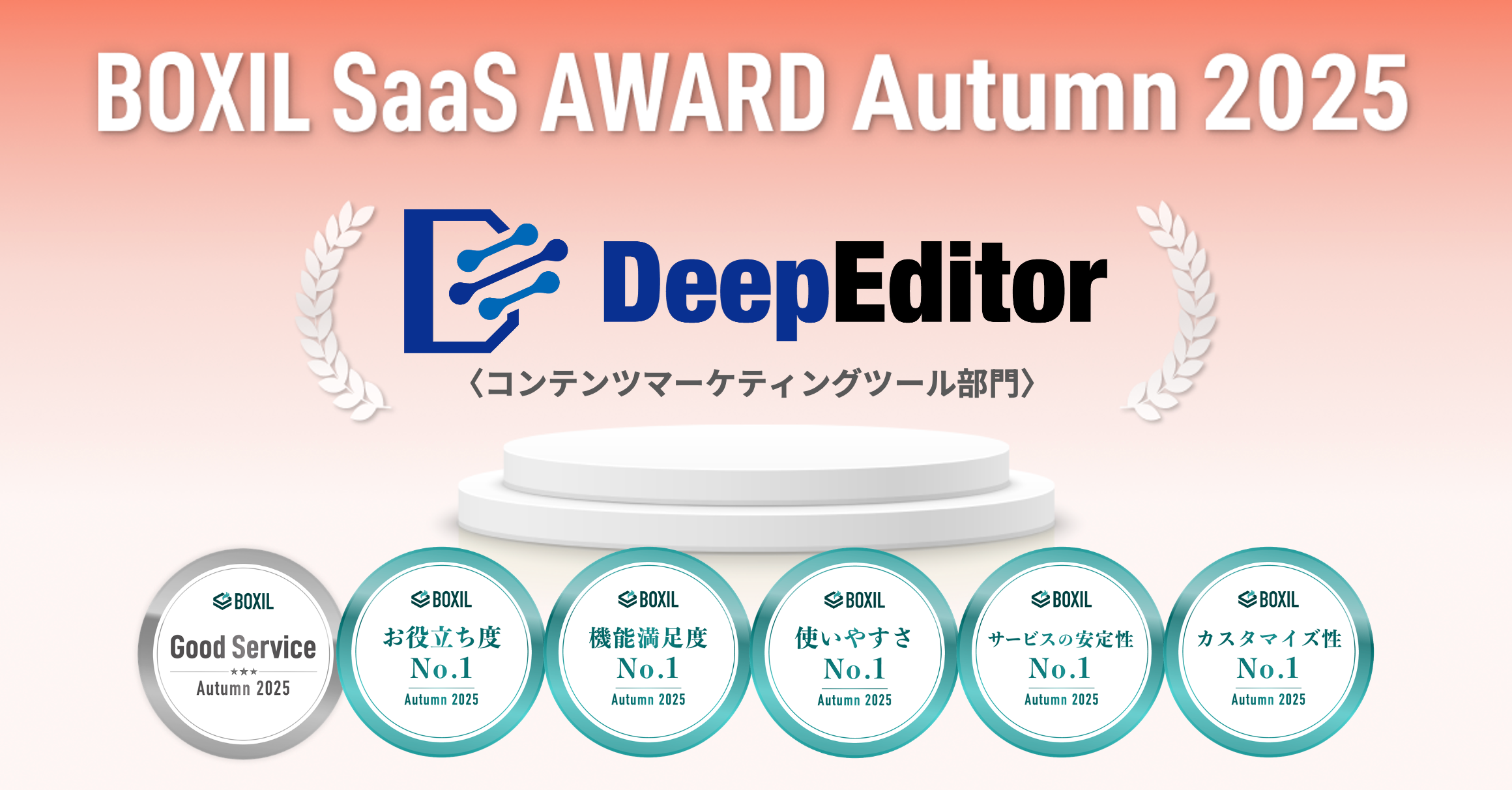 DeepEditor、「BOXIL SaaS AWARD Autumn 2025」コンテンツマーケティングツール部門で「Good Service」ほか5つのNo.1を受賞