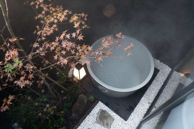 この枯山水の庭は2階のリビングの透明な床からも眺めることができ、和束町の宇治茶をお供に、当施設でしか味わえない独特な空間をお楽しみいただけます。京都には無数の日本庭園がございますが、「真上から見下ろす庭園」は唯一この「季楽 京都 本町」にのみ存在するものです。そして奥には屋外の坪庭を楽しみながら入浴できる露天風呂を設置いたしました。お好きな時間にゆったりと湯に浸かり、寛ぎの時をお過ごしください。
