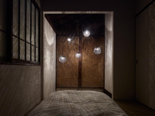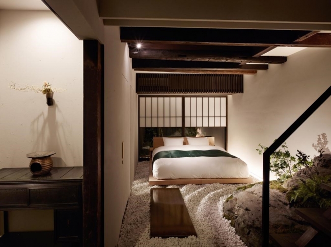宿に入りイグサの香りと昔ながらの雰囲気が漂う土間を抜けると、枯山水庭園を模した空間に広々としたベッドを置いたユニークな主寝室が広がります。一際目を引く大きな岩のアートワークは、和束町の石寺の風景がモチーフです。その岩を中心に砂利敷きの庭園に見立てた空間が演出されており、和束の大地で寝転がっているような体験を味わうことが出来ます。
