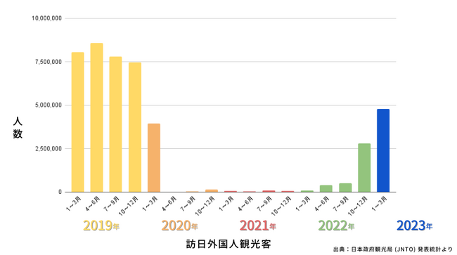 新型コロナウイルスの規制緩和に伴い、以下のグラフのように2023年の1〜3月にはコロナ前の約2/3ほどの水準まで外国人観光客数が回復傾向にあり、各地域でインバウンド向けの対策が求められています。