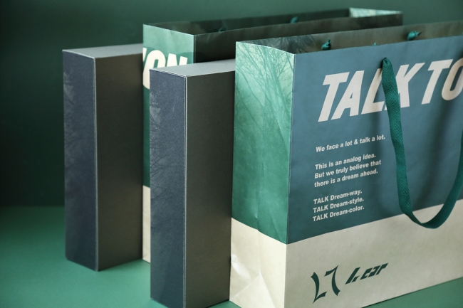 また、プレゼンテーションで使用するボックスや紙袋、パンフレットなどでは、その「繋がり」の深さと、「仲間とともに夢に向かって進んで行くんだ」という力強い想いを、広大な山々の風景や朝日が差し込む森林の風景で見立てて表現しました。