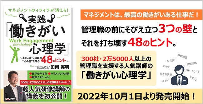 研修・出版事業を行う株式会社FeelWorks(代表取締役:前川孝雄、本社:東京都中央区、以下FeelWorks)は、グループ企業である株式会社働きがい創造研究所(取締役社長:田岡英明、本社: 東京都中央区、以下 働きがい創研)の社長である田岡英明初の単著、『マネジメントのイライラが消える! 実践「働きがい心理学」』を2022年10月1日(土)より発売します。
