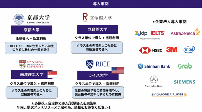 現在では、世界100カ国2,500万人に愛用されており、シティバンク、アストラゼネカといったグローバルカンパニーの英語研修をはじめ、京都大学など世界中の大学、教育機関、英会話スクールなど200を超える団体、企業への導入が進んでいます。