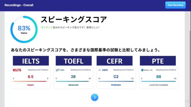 世界のAI企業100にも選ばれた独自の音声認識技術*により、学習者はピンポイントに個人のスピーキングの弱み(発音、アクセント、イントネーション、流暢さ)を特定することができます。また、AIが作成する1日10分の個別カリキュラムに取り組むことで、短期間でスピーキング力を向上させることができます。