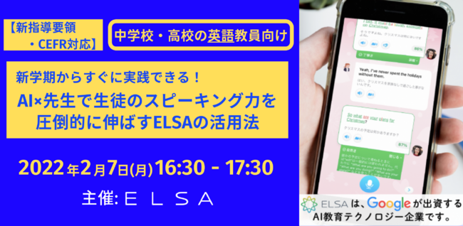 【新指導要領・CEFR対応】2/7(月) 16:30-「新学期からすぐに実践できる!AI×先生で生徒のスピーキング力を圧倒的に伸ばすELSAの活用法」ウェビナー開催