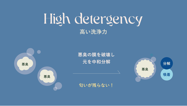 臭いの元となる膜をを破壊し、中和分解。高い消臭効果を得られます。