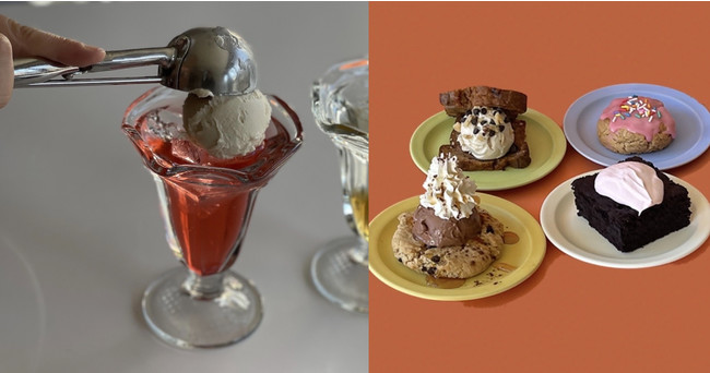 (1枚目:ラズベリークリームソーダ 750円/2枚目:左上から時計回りに バナナブレッドサンド 880円、チェリーアンドチョコレートスコッキー 580円、ブラウニーホイップ 750円、クッキーサンデー 980円 ※価格は全て税抜)