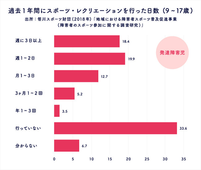 さらに、発達障害児の「過去1年間にスポーツを行っていない割合」は33.6%(※2)にもなります。