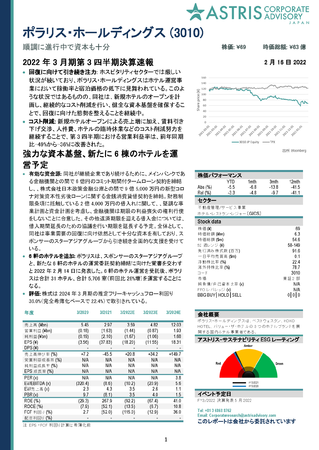 【企業レポート】ポラリスHD(東証:3010|ホテル運営)の投資家向け企業レポート第3四半期決算版がアストリス・アドバイザリー・ジャパンから配信されました。