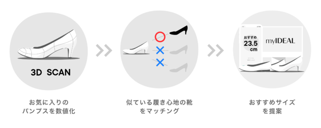 おすすめサイズ機能は、「my IDEAL」に自分にとって履き心地がいいパンプスとそのサイズを登録するだけで、3D技術によりパンプスの形状を数値化し、独自のアルゴリズムでパンプス同士をマッチングした結果から、履き心地が似た商品と最適なサイズを提案する機能です。普段24.0cmのパンプスを履いている人が、別のブランドでは23.5cmのパンプスが提案されるなど、ブランドや商品による大きさのばらつきを超えて自分の足に合うパンプスを知ることが可能です。
