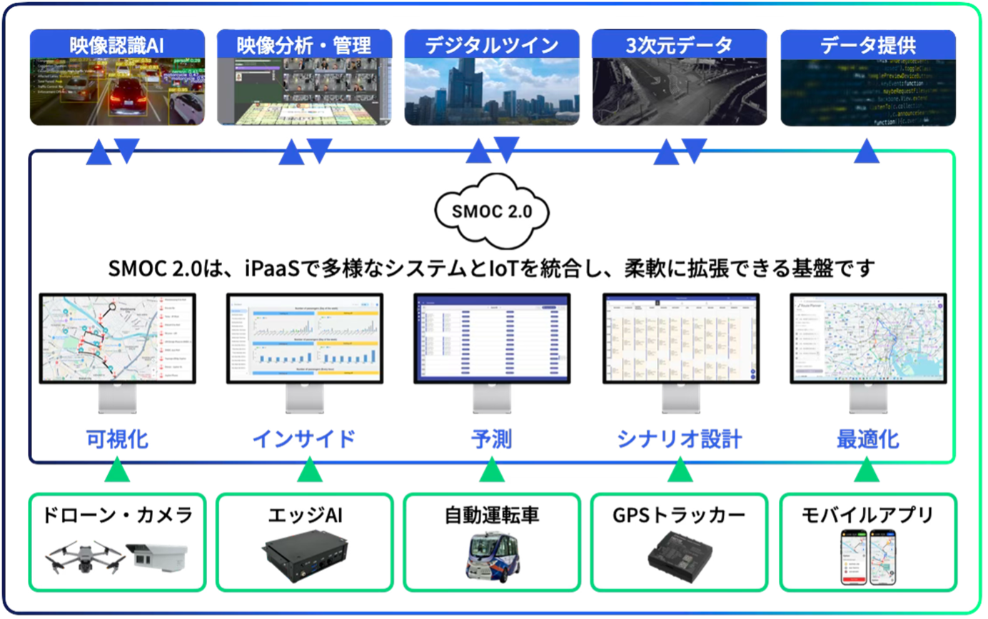 SMOC(Smart Mobility Operation Cloud)は、交通事業者・自治体・民間事業者向けに、交通量の可視化、運行計画の最適化、リアルタイムモニタリング、需要予測などの機能をクラウド上で統合的に提供するプラットフォームです。本プロジェクトでは、映像AI(エッジAI)も活用することで、移動の可視化の精度を高め、効率的な交通管理と安全・快適な都市交通運営を支援します。
