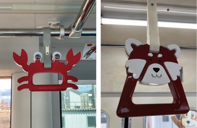 ・出入口付近のつり革は、ふくいを代表する「カニ」「レッサーパンダ」をデザインしたものを使用