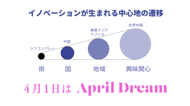 これまで、世界のイノベーションの中心は米国のシリコンバレーという街でした。その後、イノベーションが発生する場所は、中国や東南アジア・アフリカへと国や地域単位で拡大してきました。そして、現在はインターネットの普及により、その地域は世界全体へと拡大し、イノベーション中心地はいよいよ”興味関心を中心とするコミュニティ”に移りつつあります。