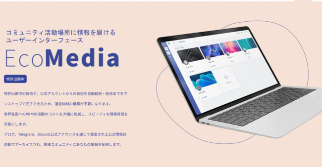 EcoMediaは、コミュニティを事業のターゲットとする組織に向けて、エンゲージメント中心の情報発信を行うことができるようになるコミュニティSaaSです。その名の通り「エコシステムの拡大がやりやすくなる情報発信」ができるように設計されており、画面にはそれぞれの契約者が自身で選んだ産業分野や特定の企業など、特定ジャンルの情報がニュースメディアのように一斉表示され、自動で多言語化されます。