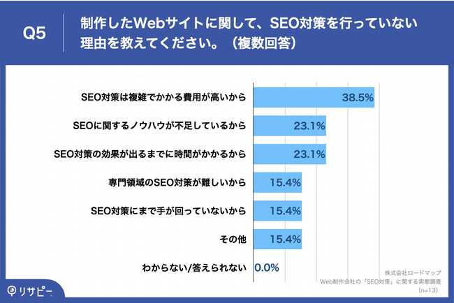 Q1で「あまり実施していない」「一切実施していない」と回答した方に、「Q5.制作したWebサイトに関して、SEO対策を行っていない理由を教えてください。(複数回答)」(n=13)と質問したところ、「SEO対策は複雑でかかる費用が高いから」が38.5%、「SEOに関するノウハウが不足しているから」が23.1%、「SEO対策の効果が出るまでに時間がかかるから」が23.1%という回答となりました。