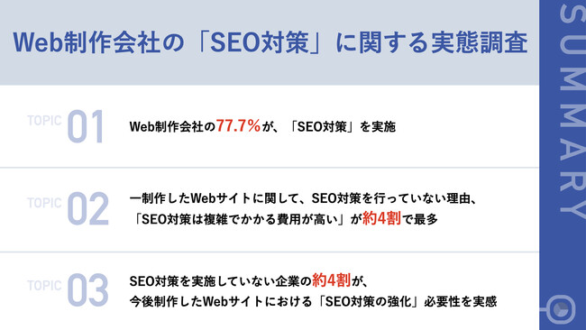 今回の調査では、自社か委託に限らず、SEO対策を実施している企業は対策の「効果」を実感しているケースが多く、対策を実施していない企業は、その「必要性」を実感していることが伝わってくる内容となりました。Web制作会社としては、心を込めて制作したWebサイトを作りっぱなしにするのではなく、SEO対策にも注力することで、更なる事業拡大への一助になると言えるのではないでしょうか。