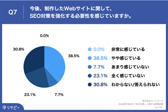 Q1で「あまり実施していない」「一切実施していない」と回答した方に、「Q7.今後、制作したWebサイトに関して、SEO対策を強化する必要性を感じていますか。」(n=13)と質問したところ、「非常に感じている」が0.0%、「やや感じている」が38.5%という回答となりました。