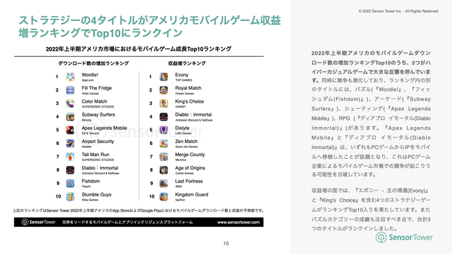 収益増の面では、『エボニー - 王の帰還(Evony)』と『King’s Choice』を含む4つのストラテジーゲームがランキングTop10入りを果たしています。またパズルカテゴリーの成績も注目すべき点で、合計3つのタイトルがランクインしました。