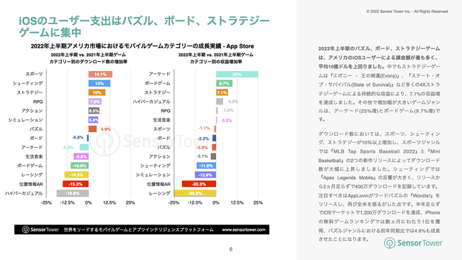 2022年上半期のパズル、ボード、ストラテジーゲームは、アメリカのiOSユーザーによる課金額が最も多く、平均10億ドルを上回りました。中でもストラテジーゲームは『エボニー - 王の帰還(Evony)』、『ステート・オブ・サバイバル(State of Survival)』など多くの4Xストラテジー製品による持続的な収益により、7.1%の収益増を達成しました。その他で増加幅が大きいゲームジャンルは、アーケード(25%増)とボードゲーム(9.7%増)です。