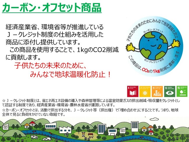 カーボン・オフセット商品とは、製品やサービスを提供する過程で発生する温室効果ガスを植林・間伐などのCO2削減・吸収活動で埋め合わせる商品です。この商品・サービスを購入、利用する方も温暖化対策に貢献できます。当社のカーボン・オフセット商品を購入・使用することで、1点あたり森林吸収クレジット1kg-CO2で埋め合わせることができます。