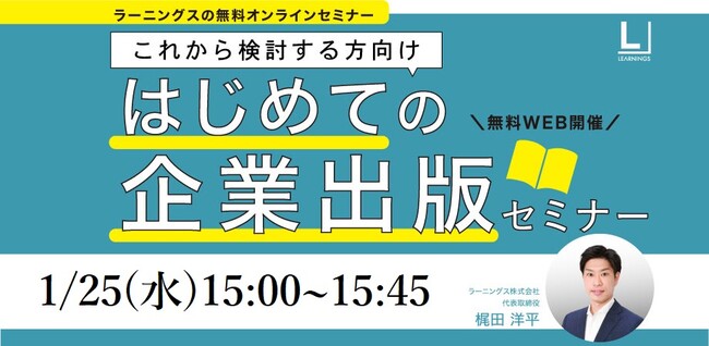 ラーニングス株式会社(本社:東京都渋谷区 代表取締役:梶田洋平 以下「ラーニングス」)は、1月25日(水)に【これから検討する方向け】はじめての企業出版セミナーをオンラインで開催します。