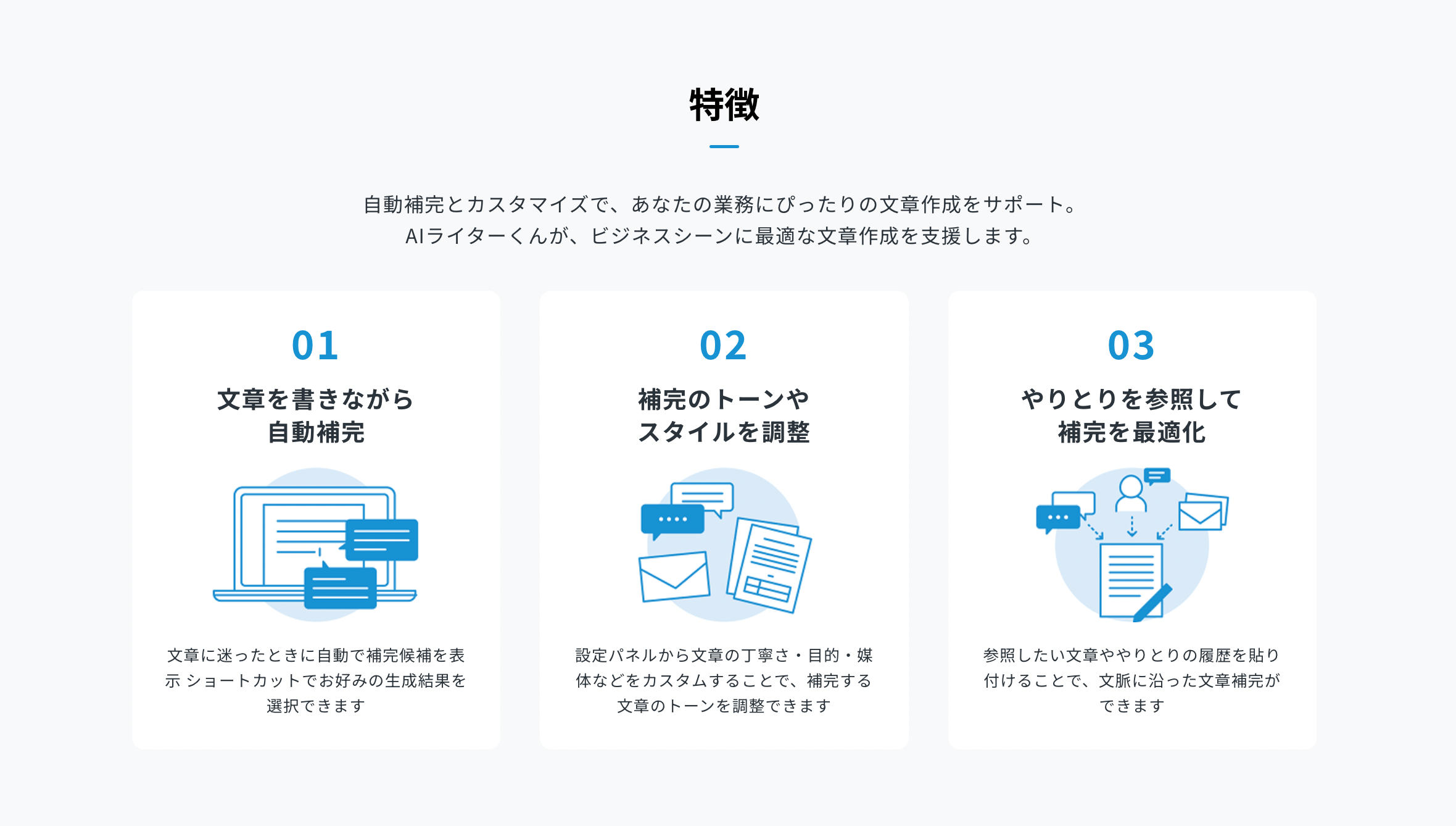 「AIライターくん」は、ビジネスパーソン向けにリアルタイムで文章補完(予測変換)を行うことができるツールです。