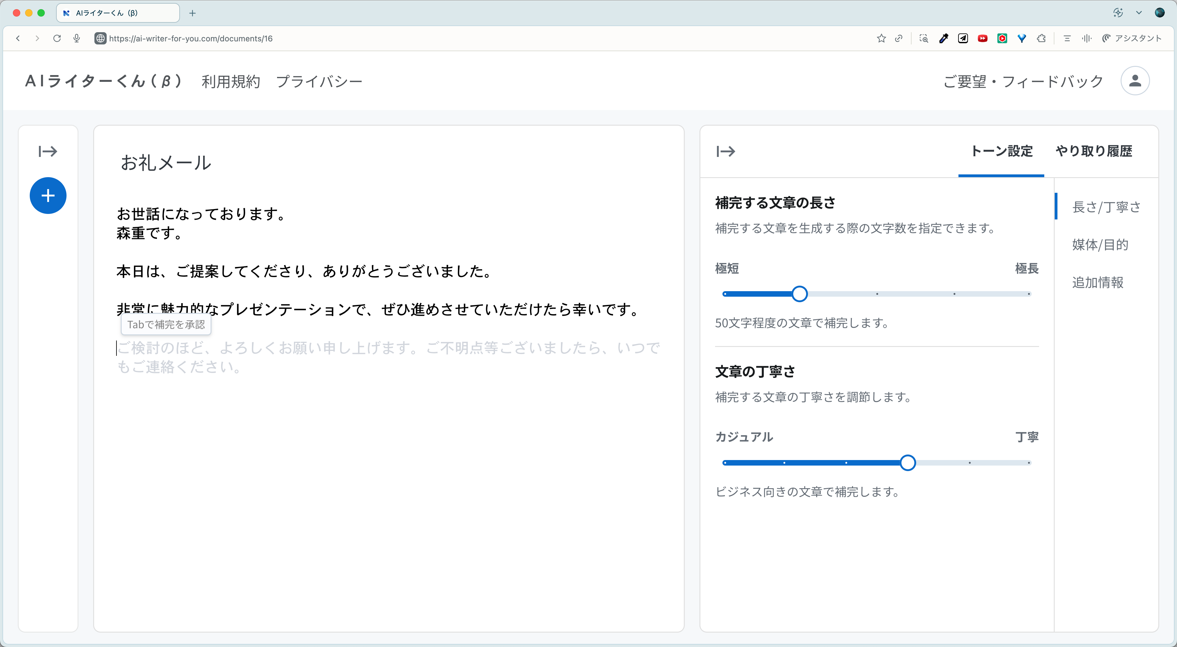 その他にも、補完する文章の長さや文章の丁寧さを調整することもできます。