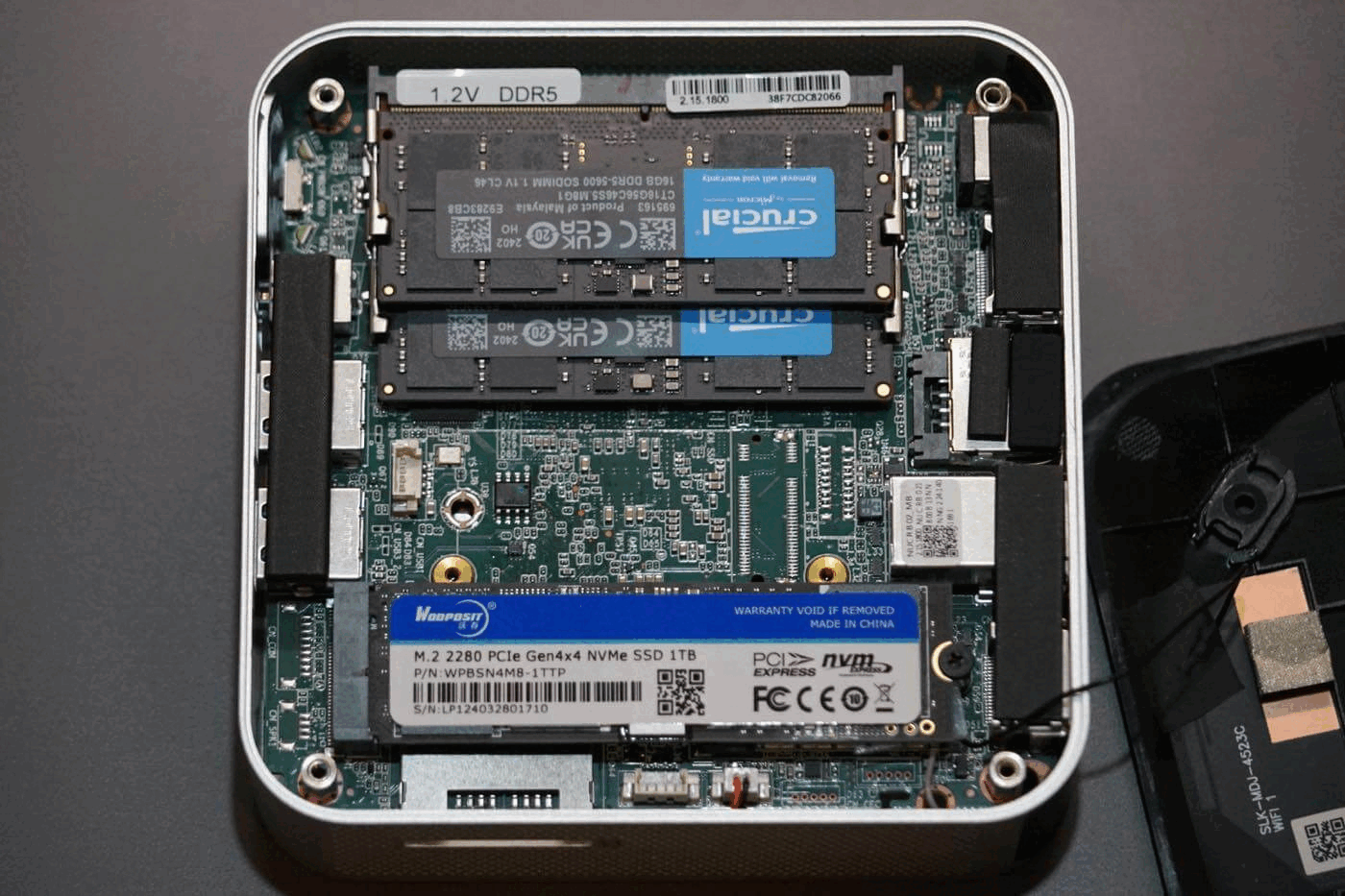 SSDはWoopositというメーカーの2280サイズのM.2 SSD(NVMe PCIe Gen4 x4)が搭載されており、レビューしたモデルは1TBですが、最大2TBまで搭載可能。スロットはこの1つだけで、換装は出来るものの、増設は不可。