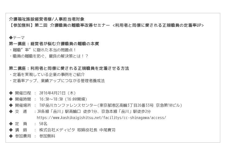 株式会社メディピタは昨年12月に満席となりご好評をいただいた「離職率改善セミナー」の内容をさらに充実させ、4月21日品川にて第二回セミナーを開催いたします。”介護職員の離職率”に着目し、今、介護事業経営に本当に必要な人材に対する考え方と取り組みを、事例を交えてご紹介いたします。
