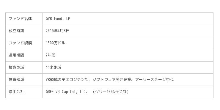『GVR Fund』を運営するグリーは2011年に北米に進出し、さまざまなスタートアップ企業や投資家とのネットワークを築いており、VR領域でのエコシステムの立ち上がりが早い北米市場において、ゲーム領域のみならず、ソフトウェアやコンテンツを提供する優良なVRスタートアップ企業を積極的に開拓し投資しています。