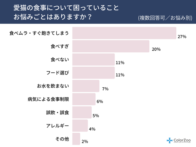 最も多いのが「食べムラ・食べ飽き」「食べない」などの嗜好性に関するお悩みで38%、次に多いのが「食べすぎ」で20%、「病気による食事制限」や「アレルギー」は合わせて10%となり、お悩みの種類も多岐にわたることが分かりました。(*1)