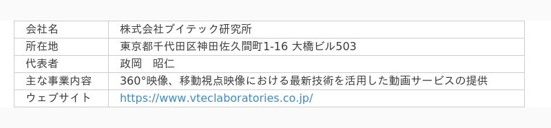 株式会社ブイテック研究所は、早送りでもブレない安定した移動視点高速映像技術や移動視点の360度映像を自在に合成する「経路映像合成技術」を確立。これらの技術を活用し、歩く移動におけるサポートサービスやインタラクティブな映像体験によるバーチャル観光などのサービスを展開しています。