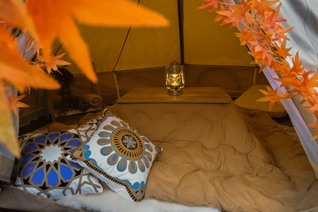 テントは今流行りのベルテント型で、雨風に強く寒い冬でもテントの中は暖かくて快適です。テントの中には、これから冷え込む時期に嬉しい「こたつ」をご用意しました。冷たい風が入ってこないテント内で入るこたつは、観光で歩き疲れて冷え込んだ体を暖かく包み込んでくれます。そのほかクッションやブランケット、グランピングらしさを楽しんでいただけるランタンや飾りつけを施しております。家族で遊ぶのも良し、カップルやお友達と話し明かすのも良し。どなたとでもお寛ぎいただけます。