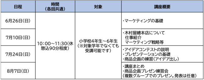 今回は、小学校4年生から6年生を対象に、「マーケティングの基礎知識」から、「商品開発の考え方」、「プレゼンテーションとは」等のテーマを通して、新商品が生み出されるサービスの仕組みを学べる内容となっております。また夏休み期間中にはアイデアコンテストを予定し、優秀なアイデアは木村屋總本店にて商品化の可能性もあるため、是非奮ってご参加ください!